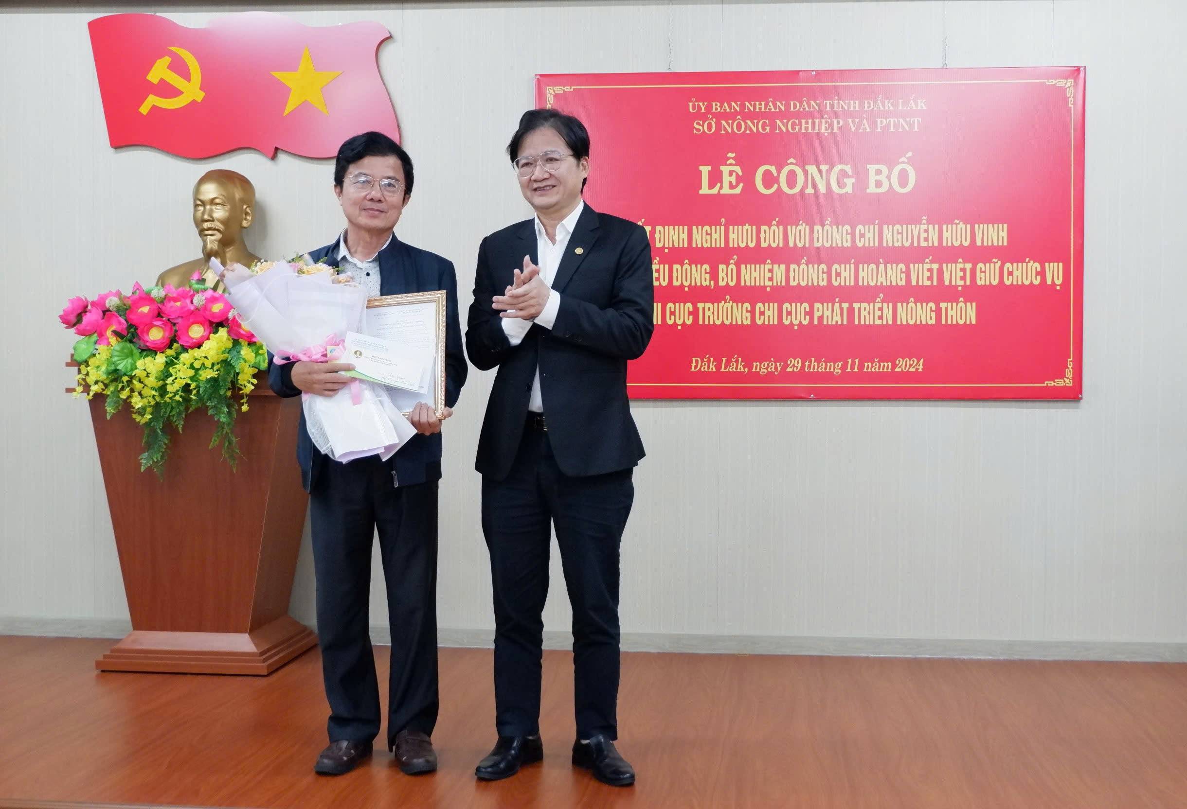 Chiều 29/11/2024, Sở Nông nghiệp và Phát triển nông thôn (NN&PTNT) tỉnh Đắk Lắk tổ chức Công bố Quyết định nghỉ hưu đối với đồng chí Nguyễn Hữu Vinh và Quyết định bổ nhiệm đồng chí Hoàng Viết Việt, Chánh Văn phòng Sở giữ chức vụ Chi cục trưởng Chi cục Phát triển nông thôn.